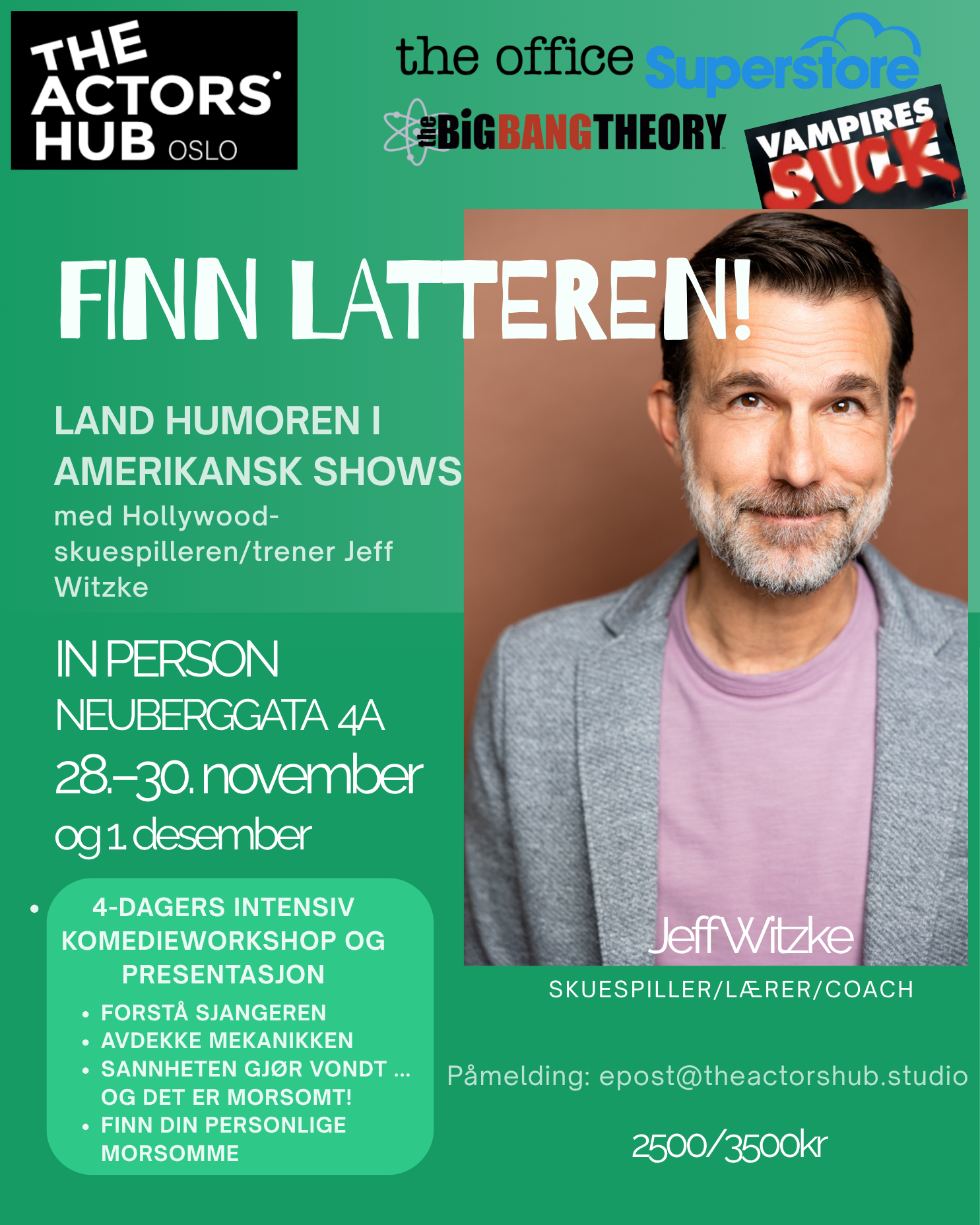 Hollywood-skuespiller og coach Jeff Witzke (Shameless, Modern Family, Scandal) kommer til Oslo i november med en intensiv workshop i komedie. Her lærer du å lande humoren på en sann, karakterdrevet måte – fra single-camera og multi-cam sitcoms til romantiske komedier. For de som velger showcase-alternativet, blir det i tillegg en bransjevisning foran inviterte agenter, produsenter og castingdirektører.