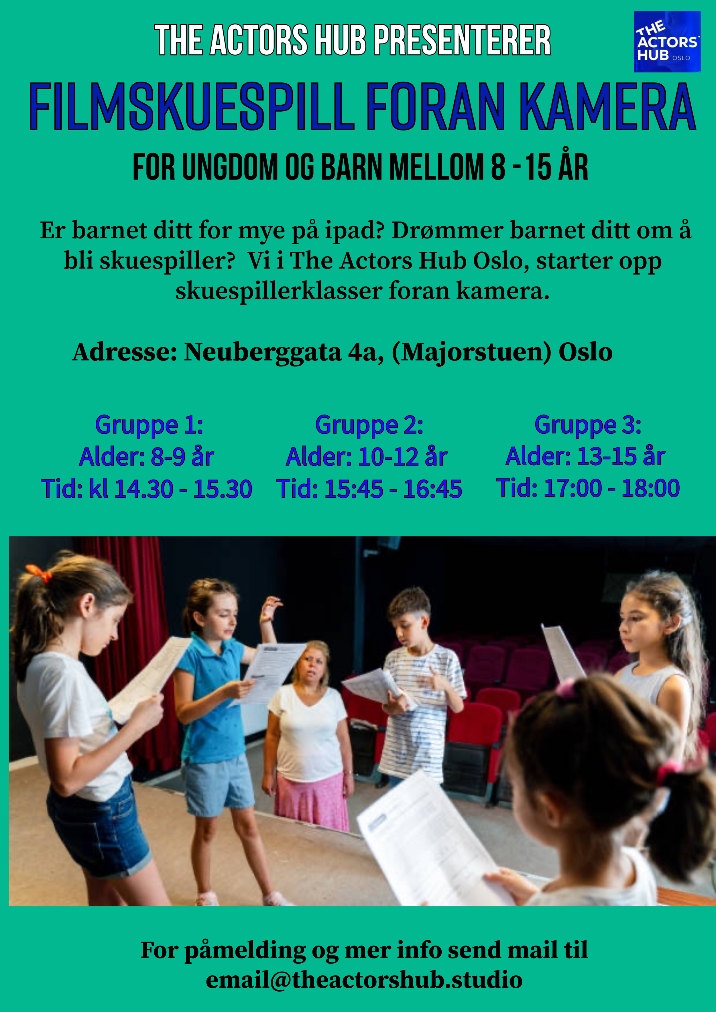 Drømmer du om å stå foran kamera og lære ordentlig skuespillerteknikk? Nå har du sjansen! SØNDAGER og TORESDAGER (OBS ULIKE TIDER) starter vi i The Actors hub Method Acting-klasser for barn og ungdom mellom 8 og 15 år! Gjennom seks gøyale økter lærer du skuespillteknikker, øver på filmscener og til slutt filmer vi dine scener – som du kan bruke videre i din skuespillerkarriere!