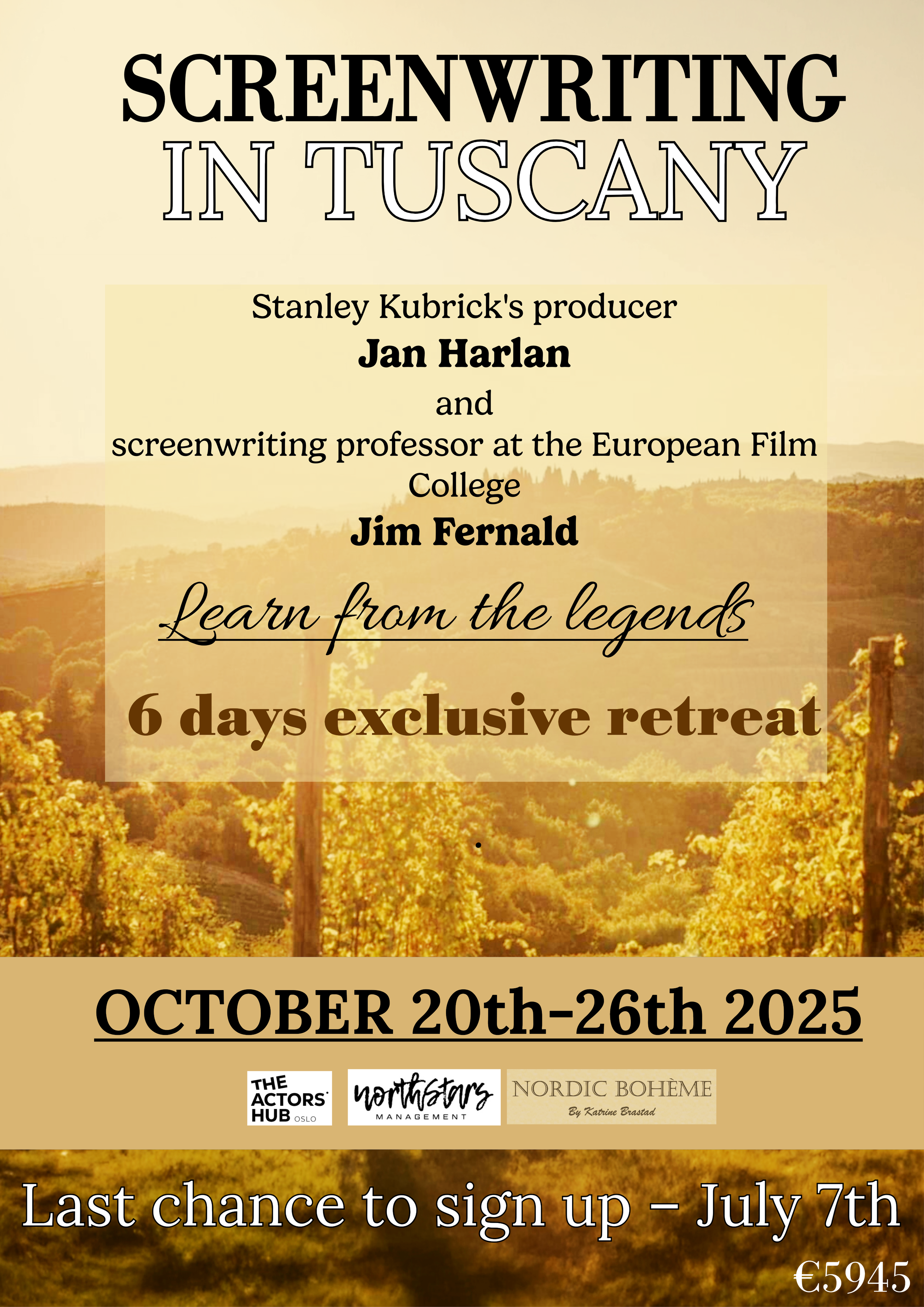 SCREENWRITING IN TUSCANY WITH STANLEY KUBRICK`S PRODUCER JAN HARLAN AND JIM FERNALD Limited spots availableBooking closes July 1st I agree to the Terms and Conditions.